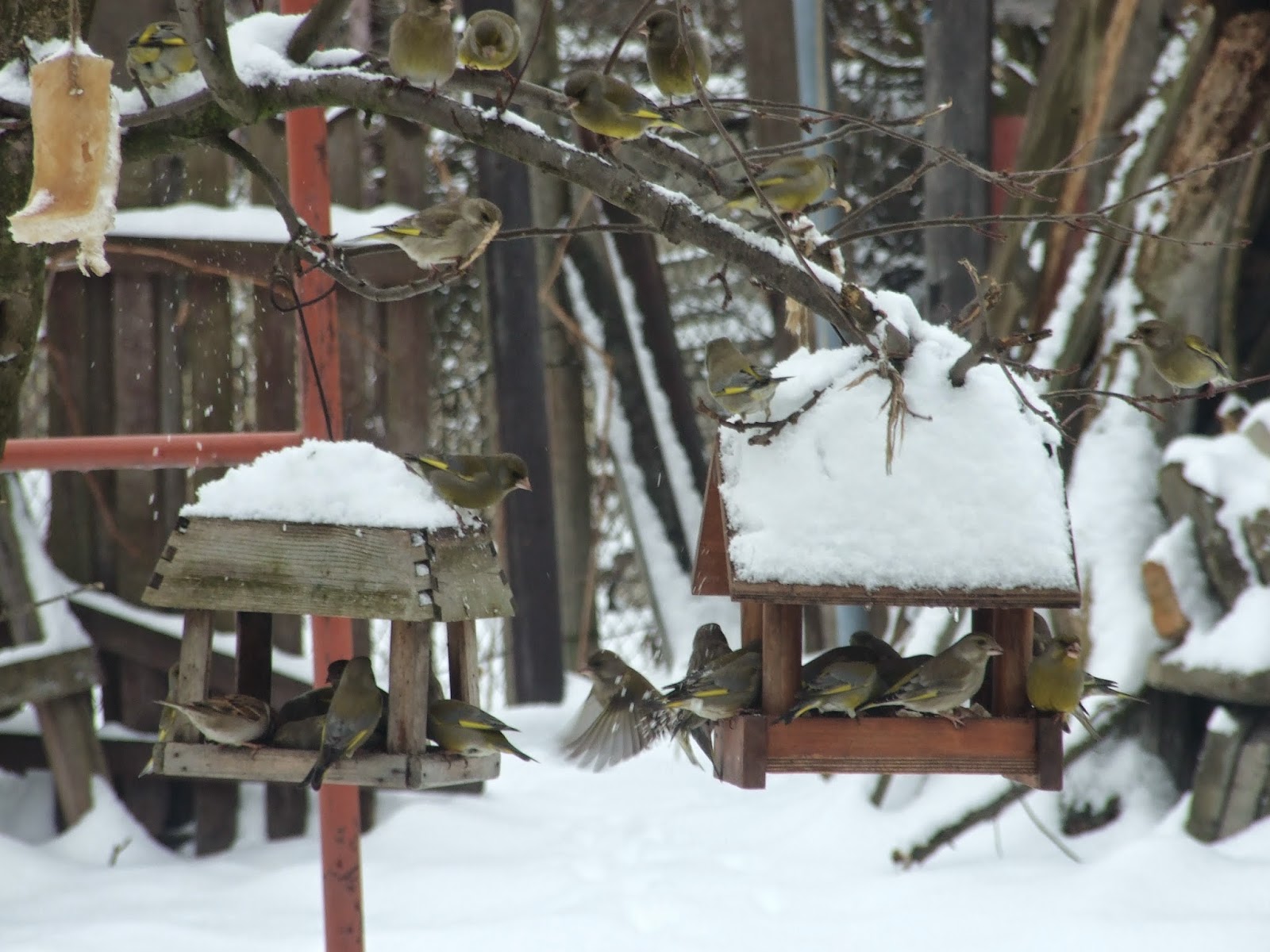 obserwowała karmniki razem z kotami. Ptaków było dużo. Jedne wpadały na chwilę,