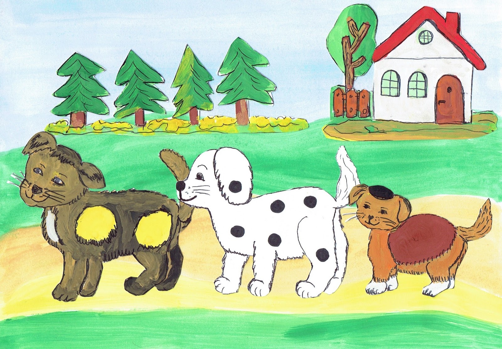 kolejno wchodzą na środek sceny i po przedstawieniu swojej roli ustawiają się w